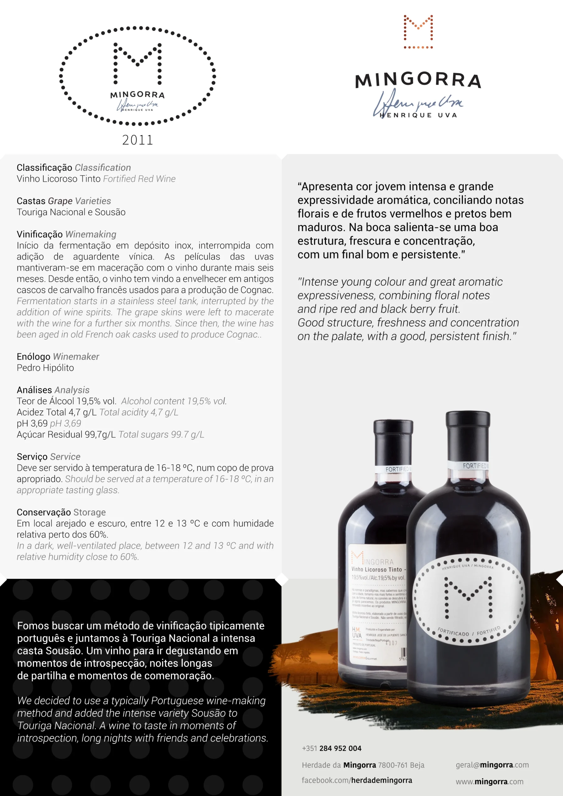Há normas e paradigmas, mas sabemos que crescer é acrescentar. Então, com a idade, tornamo-nos mais fortes e sentimo-nos mais jovens. Esperamos que, de forma natural, no convívio se descubra e confirme o que, de verdade, já agora parecemos. Os produtos MINGORRA são assim: um verídico e renovado incentivo ao original. Vinho licoroso tinto, elaborado a partir de uvas das nossa vinhas, das castas Touriga Nacional e Sousão. Não sendo filtrado, está sujeiro a criar depósito.